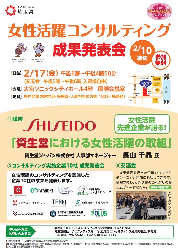 【お問い合わせ先】 埼玉新聞社 クロスメディア局 「女性活躍コンサルティング成果発表会」事務局 TEL:048-795-9932 FAX:048-662-6610