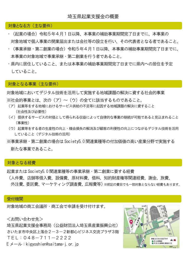 【お問い合わせ先】 埼玉県起業支援金事務局(公益財団法人埼玉県産業振興公社) さいたま市中央区上落合2-3-2 新都心ビジネス交流プラザ3階 TEL:048-711-2222 Mail:kigyoshien@saitama-j.or.jp