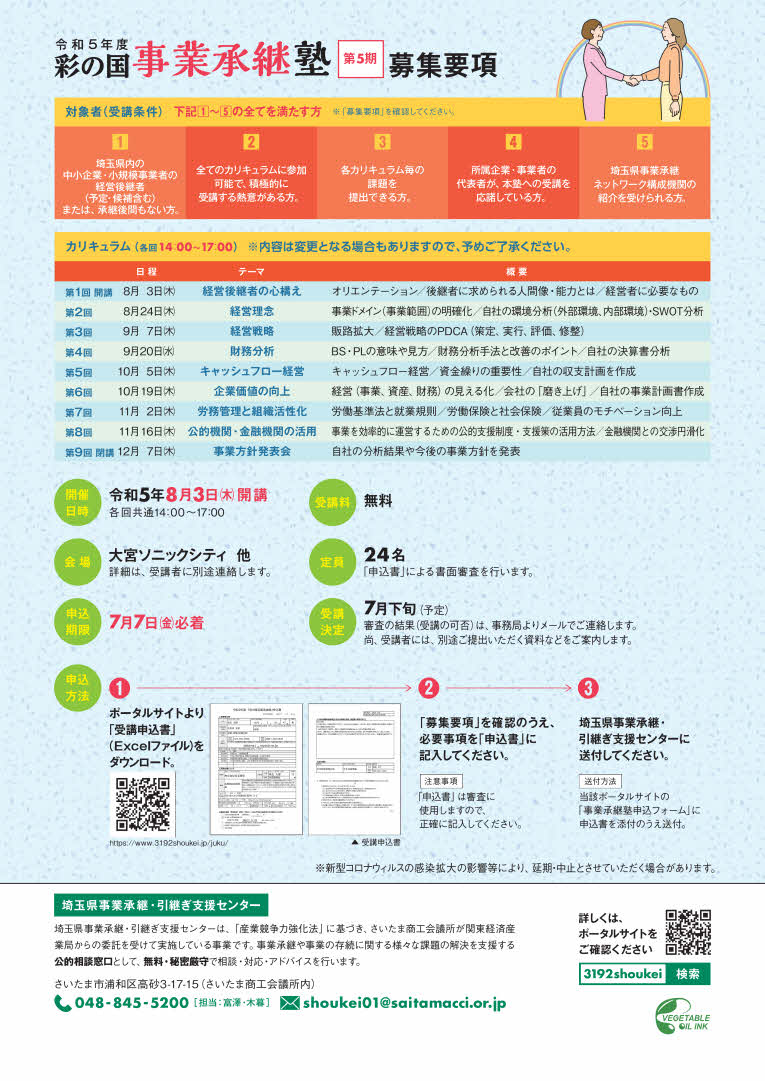 【お問い合わせ先】 埼玉県事業承継・引継ぎ支援センター さいたま市浦和区高砂3-17-15(さいたま商工会議所内) TEL:048-845-5200
